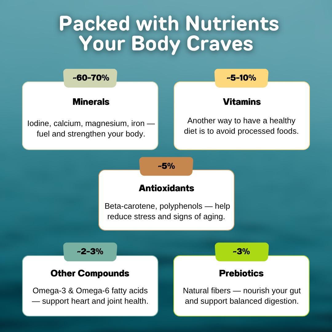 Our premium Irish moss gel is packed with over 90 essential minerals, vitamins, antioxidants, and enzymes, delivering a comprehensive nutrient profile to support your wellness journey.